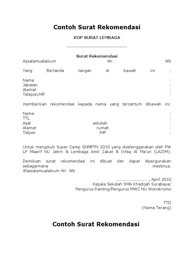 Surat rekomendasi beasiswa biasanya diperlukan oleh seseorang yang masih berstatus sebagai. Contoh surat rekomendasi sekolah dan bagian bagian yang membentuknya. Siapa yang pernah diminta untuk membuat surat untuk kakak kelas atau kakak osis? Jika anda sedang mencari informasi mengenai surat rekomendasi, saat ini anda membaca artikel yang tepat. Untuk mengikuti super camp zakat amaliah 2018 yang diselenggarakan oleh pw lp syariah nu aceh barat.