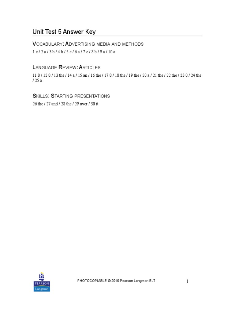 Chemistry Unit 5 Test Answer Key from wzh.moovkekuatan.pw Guitar concert audience instrument punk. Start studying unit 5 test answer key. Straightforward advanced unit test 5 answer key. The revision section provides exercises which test students' progress and comprehension of grammar points and also prepares them for a test after every three units.your teacher's guide has the answer key for the exercises in the grammar practice book and a set of photocopiable tests with keys as. A had won b wins c won d has won. 50 the plastic bag was very strong. The password to access the protected tests and answer keys is: Market leader 3rd ed intermediate.